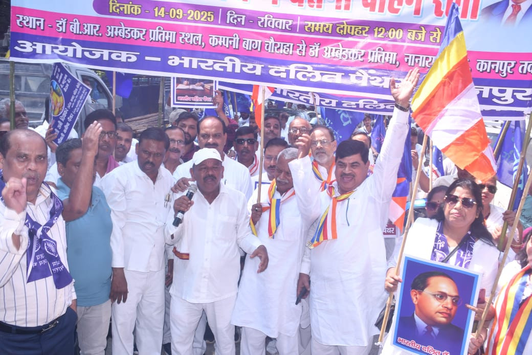 भारतीय दलित पैंथर कानपुर नगर ईकाई के तत्वावधान में डॉ बाबासाहेब भीमराव अंबेडकर प्रतिमा स्थल कंपनी बाग चौराहा से डॉ अंबेडकर "धम्म चेतना वाहन रैली" का आयोजन किया गया। डॉ अंबेडकर धम्म चेतना वाहन रैली का समापन अंबेडकर प्रतिमा स्थल नानाराव पार्क, कानपुर नगर में समाप्त हुई।धम्म चेतना वाहन रैली के संयोजक एवं भारतीय दलित पैंथर के प्रांतीय अध्यक्ष धनीराम पैंथर जी ने आए हुए जन समूह को संबोधित करते हुए बताया के विगत वर्षों के भांति इस वर्ष भी कृषि मंडी समिति पुखरायां कानपुर देहात में 32वें विशाल बौद्ध धम्म दीक्षा समारोह एवं डॉ आंबेडकर मेला का आयोजन दिनांक 2 अक्टूबर 2025 को किया जा रहा है जिसमें महान सम्राट महामानव रावण,अशोक सम्राट, तथागत गौतम बुद्ध व डॉ साहब भीमराव अंबेडकर की शोभा यात्रा निकाली जाएगी। जहां पर लगभग 10000 लोग हिंदू धर्म छोड़कर बौद्ध धर्म की दीक्षा ग्रहण करेंगे।कार्यक्रम में प्रमुख रूप से यशवंत सिंह यादव संस्थापक, अशोक यादव प्रदेश अध्यक्ष, साजिद सर, पास्टर जितेंद्र सिंह. इंजी, कोमल सिंह,डॉ संजय गुप्ता, विनोद पाल, सुभाष साहू, हरिओम खन्ना,सुधीर कुमार,चंदन निषाद,एम बी गौतम,शैलेंद्र कुमार प्रांतीय महासचिव,रमेश बौद्धाचार्य ,डॉ सुभाष चंद्र, आर ए गौतम,सतीश चंद्र, आनंद प्रकाश, शिव प्रताप बौद्ध, श्रवण कुमार,डॉ जे आर बौद्ध, हरिश्चंद्र,लाल जी गौतम,रवि गौतम, रामचंद्र निषाद, अरुण कुशवाहा,भगवान दीन वर्मा,राहुल गौतम,अजय वर्मा, जीतू सोनकर, कुनाल,रमेश कमल,सफीक सिद्दीकी,मीना वर्मा, राधेश्याम भारती,दीपक राज, सुभाष यादव,वरूण पैंथर,मुन्ना गौतम,सरवन कुमार पंकज झा,मुकेश गौतम,राहुल देव यादव, अनिल जायसवाल, अनिल प्रजापति, रोशन साहू, आशीष गुप्ता, विनीत कुमार, जय कठेरिया,सोनू टी स्टाल,रिंकू गौतम, मनीषा पैंथर, रानी दिवाकर,जीतू पैंथर, बीरेंद्र बहुजन, संदीप कुरील, पिंकी चंद्रा,सुधा गौतम, अर्चना,सुनीता, नवीन यादव, प्रदीप कुमार,परशुराम ,रिजवान, दीपक गौतम, जितेन्द्र संखवार,अवधेश कुमार,मस्तराम, पुनीत , अज्जू पैंथर सहित सैकड़ो लोग उपस्थित रहे।
