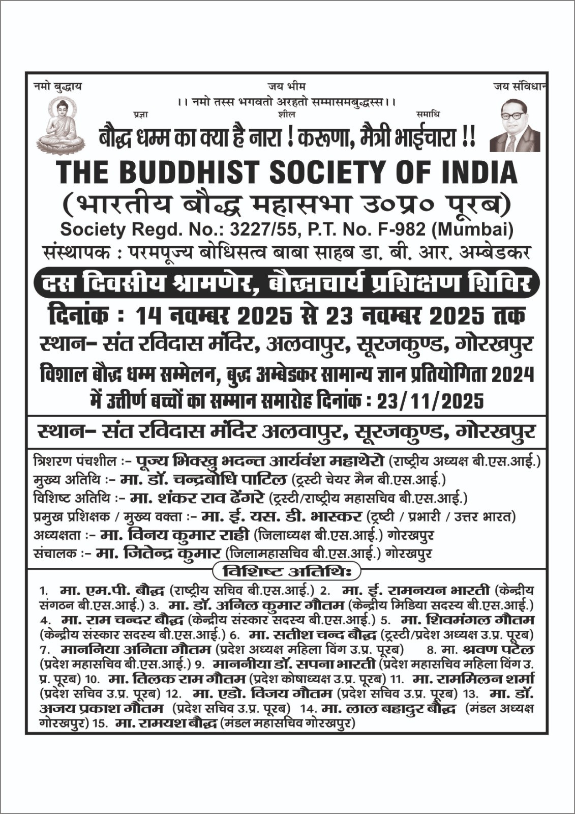 दि बुद्धिस्ट सोसाइटी ऑफ इंडिया भारतीय बौद्ध महासभा जिला इकाई गोरखपुर के तत्वावधान में 14 नवम्बर से 23 नवम्बर 2025 तक स्थान संत रविदास मंदिर अलवापुर सूरजकुण्ड, गोरखपुर में विशाल बौद्ध धम्म सम्मेलन, बुद्ध अम्बेडकर सामान्य ज्ञान प्रतियोगिता 2024 में उत्तीर्ण बच्चों का सम्मान समारोह 23 नवंबर को मुख्य अतिथि डॉ चन्द्रबोधि पाटिल ट्रस्टी चेयरमैन बीयसआई के द्वारा किया जाएगा। समारोह में त्रिशरण पंचशील पूज्य भिक्खु भदन्त आर्यवंश महाथेरो राष्ट्रीय अध्यक्ष बी.एस.आई के द्वारा किया जायेगा। मुख्य अतिथि डॉ. चन्द्रबोधि पाटिल ट्रस्टी चेयर मैन बी.एस. आई, विशिष्ट अतिथि शंकर राव ढंगरे ट्रस्टी / राष्ट्रीय महासचिव बी.एस.आई, प्रमुख प्रशिक्षक एवं मुख्य वक्ता ई. यस. डी. भास्कर ट्रष्टी / प्रभारी / उत्तर भारत होगे। अध्यक्षता विनय कुमार राही जिलाध्यक्ष बी.एस.आई. गोरखपुर। विशिष्ट अतिथियों मे एम.पी. बौद्ध राष्ट्रीय सचिव, ई. रामनयन भारती केन्द्रीय संगठक, डॉ. अनिल कुमार गौतम केन्द्रीय मिडिया सदस्य, राम चन्दर बौद्ध केन्द्रीय संस्कार सदस्य, शिवमंगल गौतम केन्द्रीय संस्कार सदस्य , सतीश चन्द बौद्ध ट्रस्टी / प्रदेश अध्यक्ष उ.प्र. पूरब, अनिता गौतम प्रदेश अध्यक्ष महिला विंग उ.प्र. पूरब, श्रवण पटेल प्रदेश महासचिव, डॉ. सपना भारती प्रदेश महासचिव महिला विंग उ. प्र. पूरब, लाल बहादुर बौद्ध मंडल अध्यक्ष गोरखपुर, रामयश बौद्ध मंडल महासचिव गोरखपुर की सहित तमाम पदाधिकारीयों के महत्वपूर्ण उपस्थित रहेंगी। समारोह की अध्यक्षता जिला अध्यक्ष विनय कुमार राही एवं संचालन जितेंद्र कुमार जिला महासचिव के द्वारा किया जायेगा। जिला अध्यक्ष विनय कुमार राही ने सभी धम्म प्रेमियों से अपील किया है कि अधिक से अधिक संख्या में उपस्थित होकर समारोह को सफल बनाएं।