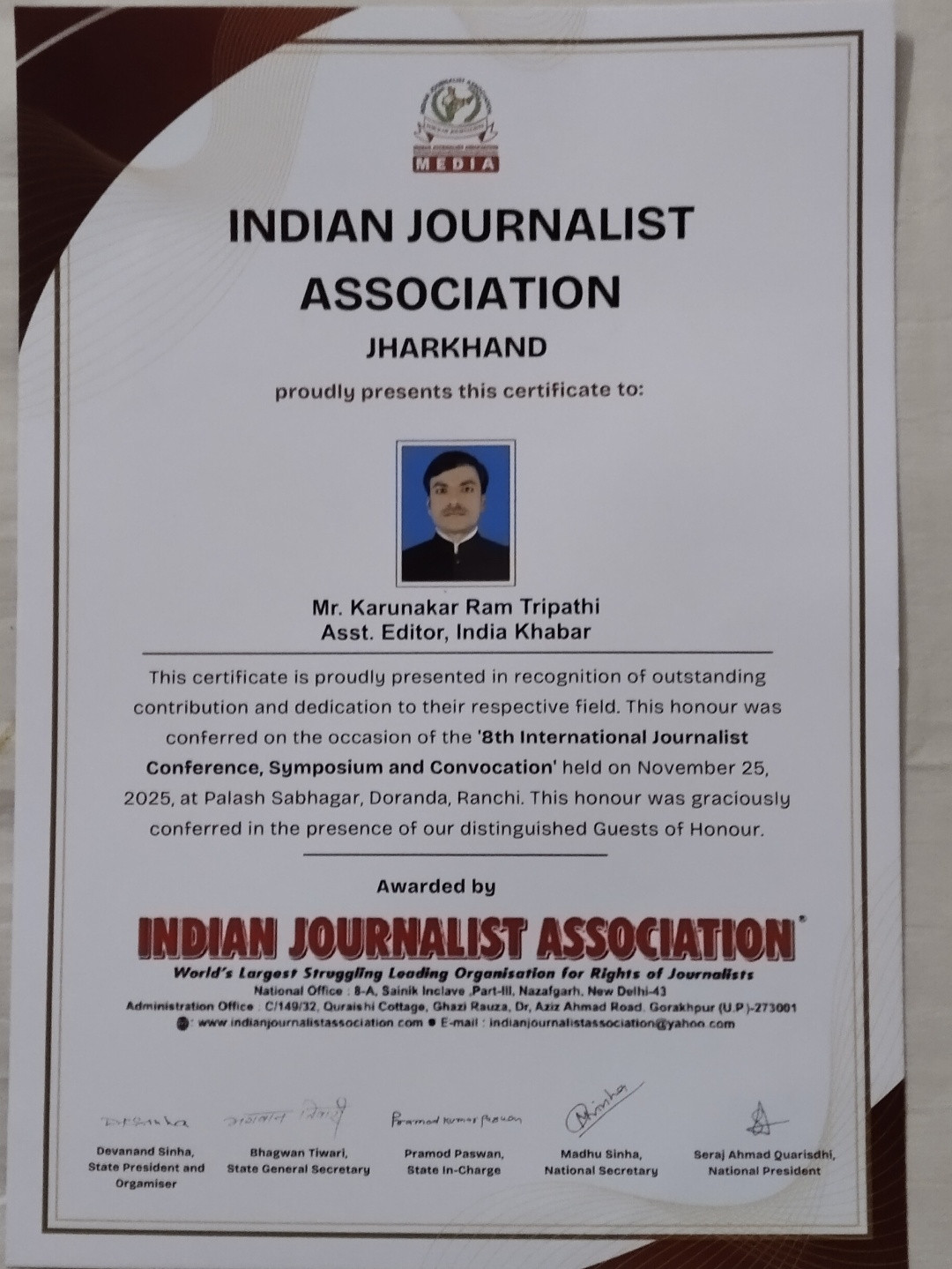 On Karunakar Ram Tripathi being honored in Ranchi, Jharkhand, Indian Journalist Association's National Vice President Satendra Kumar Mishra, National Organization Secretary Akhilesh Dhar Dwivedi, National Treasurer Salman Ahmed, State President Purvanchal Surendra Kumar Singh State, State Executive Member Rajan Ram Tripathi, Avneesh Tripathi, District President of Maharajganj District Unit Ramchandra Rawat, District General Secretary Navneet Tripathi, District Patron Ajay Pandey, Sandeep Pandey, Mahesh Vishwakarma, Ram Ashish Vishwakarma, Biju Mohan, Amit Mishra, Avinash Mishra along with all the office bearers of the organization and his well wishers congratulated and wished him.