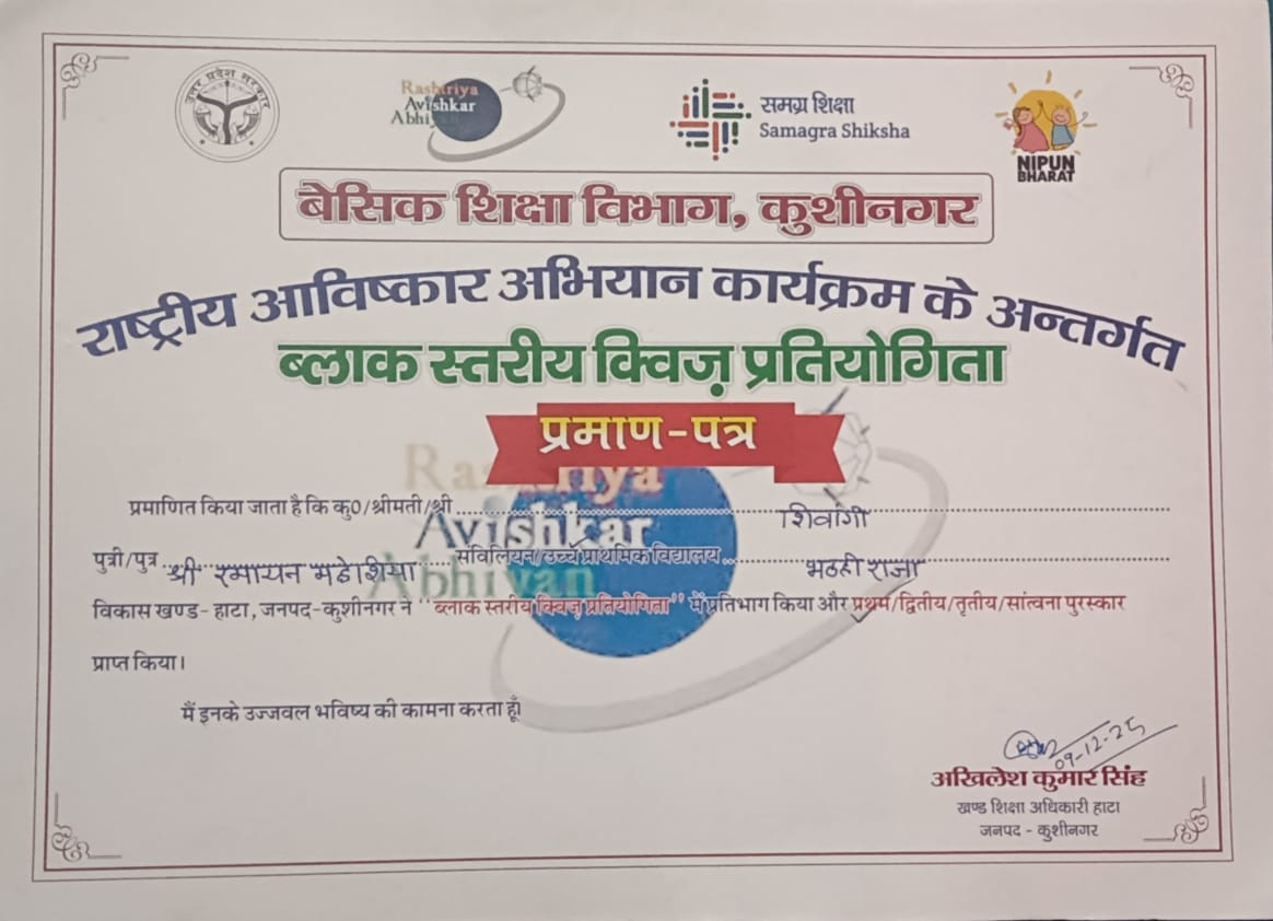 राष्ट्रीय अविष्कार क्विज प्रतियोगिता में UPS भठही राजा क्षेत्र-हाटा जनपद -कुशीनगर की छात्रा शिवांगी ने 75छात्र छात्राओं को पछाड़ती हुई प्रथम चक्र में 35अंक में 34 और दूसरे राउंड में 25अंक में 24अंक प्राप्त किया ।बेसिक शिक्षा परिषद द्वारा नामित पैनल द्वारा ब्लाक में प्रथम स्थान प्राप्त ब्लाक हाटा में अपनी योग्यता का परचम लहराया है ।