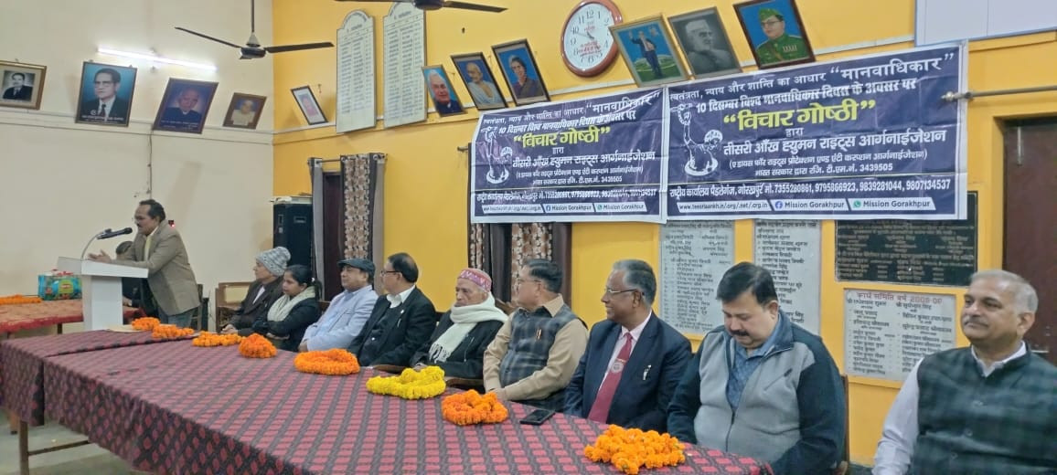 विश्व मानवाधिकार दिवस के मौके पर तीसरी आंख ह्यूमन राइट्स आर्गनाइजेशन के तत्वावधान में जिला अधिवक्ता सभागार में स्वतंत्रता, न्याय और शांति का आधार मानवाधिकार की भूमिका नामक संगोष्ठी का आयोजन वरिष्ठ अधिवक्ता एवं जिला अधिवक्ता एसोसिएशन के पूर्व अध्यक्ष रत्नेश्वर शुक्ल की अध्यक्षता में आयोजित हुई। कार्यक्रम के मुख्य अतिथि अधिष्ठाता अधिष्ठान विधि विभाग गोविवि के जितेंद्र कुमार मिश्र थे। जबकि विशिष्ट अतिथि जिला अधिवक्ता एसोसिएशन के अध्यक्ष एवं वरिष्ठ अधिवक्ता प्रमोद कुमार पांडेय, जिला अधिवक्ता एसोसिएशन के महामंत्री चन्द्र प्रकाश मिश्र, मदन मोहन मालवीय औधोगिक विश्वविद्यालय के पर्यावरण विध के प्रो. गोविन्द पांडेय एवं मुख्य वक्ता के रूप में वरिष्ठ अधिवक्ता उदय प्रताप सिंह थे। संचालन का दायित्व वरिष्ठ अधिवक्ता अनुप पांडेय ने निभाया।