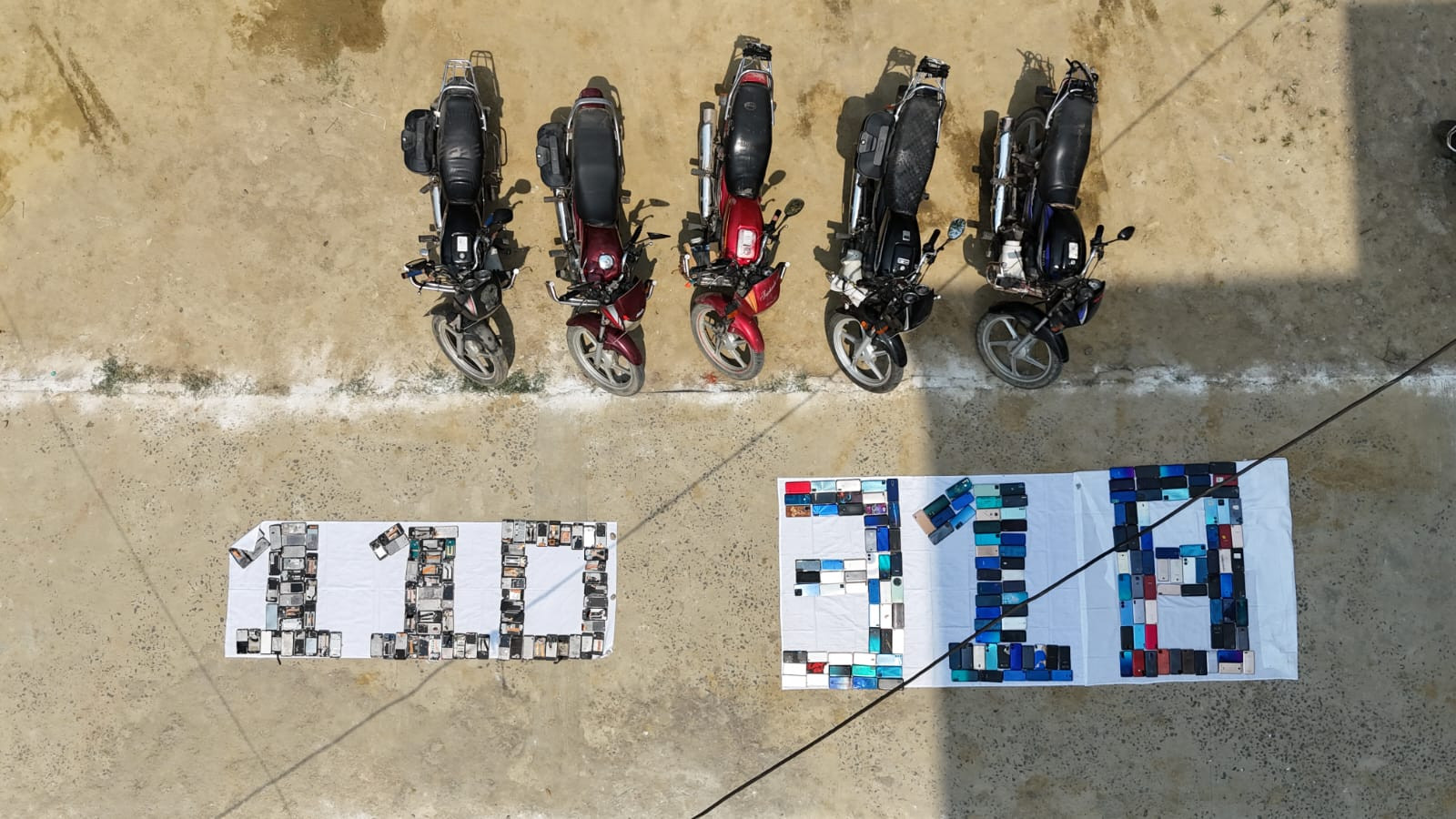 पुलिस ने आरोपियों के पास से भारी मात्रा में सामान बरामद किया है जिसमें 318 एंड्रॉइड मोबाइल (लगभग 80 लाख रुपये कीमत) 110 मोबाइल मदरबोर्ड, 55 फर्जी बिल/पर्चियां, 5700 रुपये नकद और 5 मोटरसाइकिल बरामद किया है।